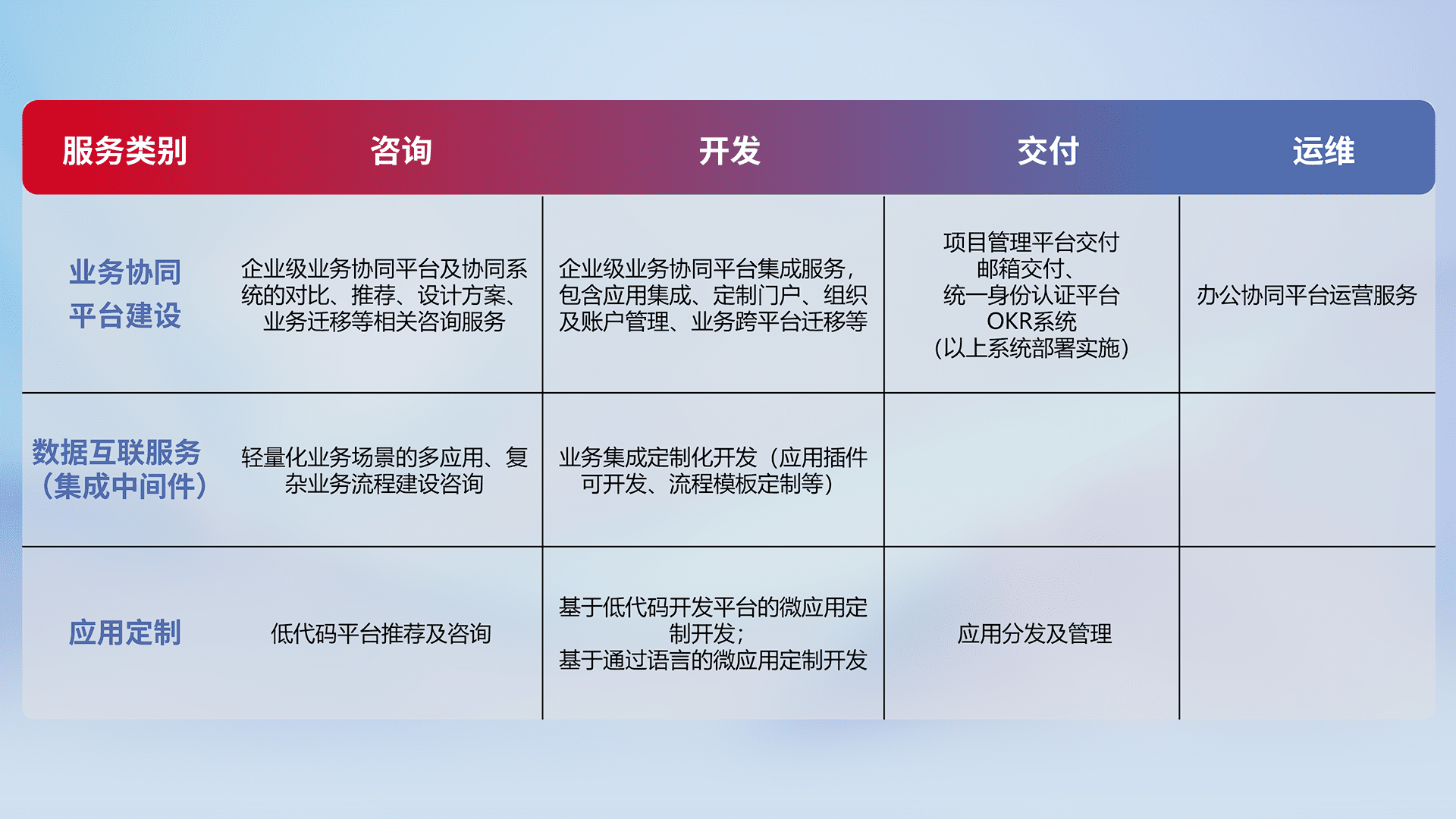 针对钉钉、、、企微、、、IDaas等平台级产品提供产品的规划、、、方案、、交付、、、定制化开发等服务,,实现如统一协同办公、、、智能客户服务、、、混合会议管理、、、、智能数据查询、、、等业务场景,,,实现数字化转型。。。